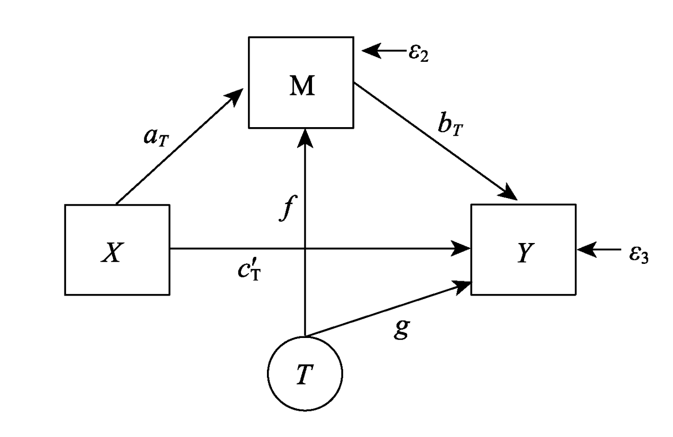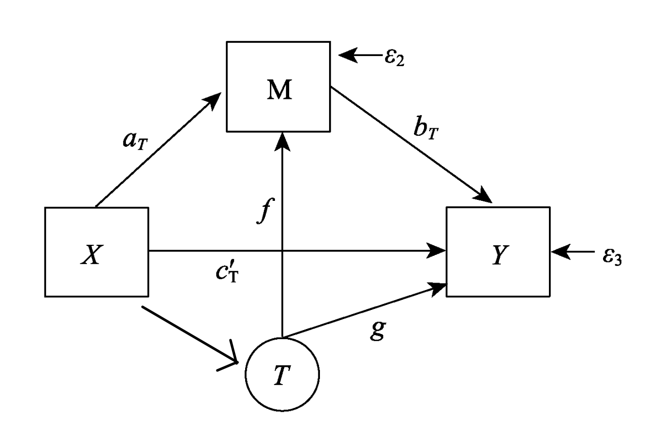 X之后, 其可能受X的影响; 此种情况下应把混淆变量当成新的中介变量进行分析, 即增加X->T->M、X->T->Y、X->T->M->Y三个路径