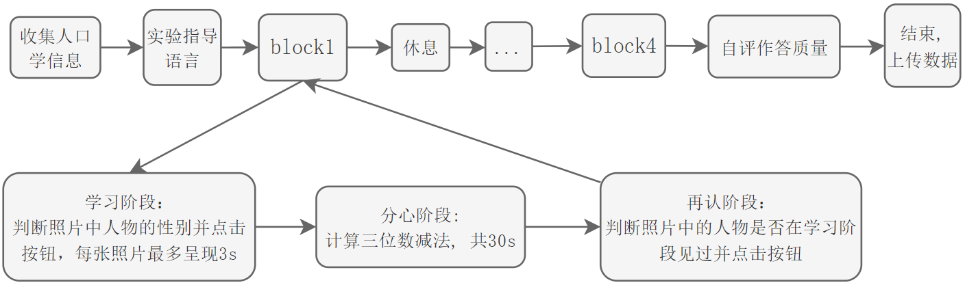 正式实验阶段分为 4 个 block,在第一个 block 开始前, 被试会看到实验说明, 并点击”开始”按钮进入实验; 每个 block 包含学习阶段, 分心阶段, 再认阶段.