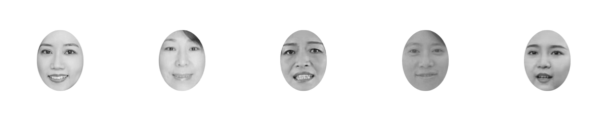 最后, 图片全部裁切为正方形, 图片像素不低于 200 x 200,每张图片的人脸宽度和高度占图片宽度和高度的约 1/2, 并将头发、耳朵、脖子等外部特征模糊化, 以便控制外部特征对实验结果的影响 (吕勇, 2010). 图片进行灰度处理, 以消除颜色对实验结果的影响. 最终材料效果见图 1.