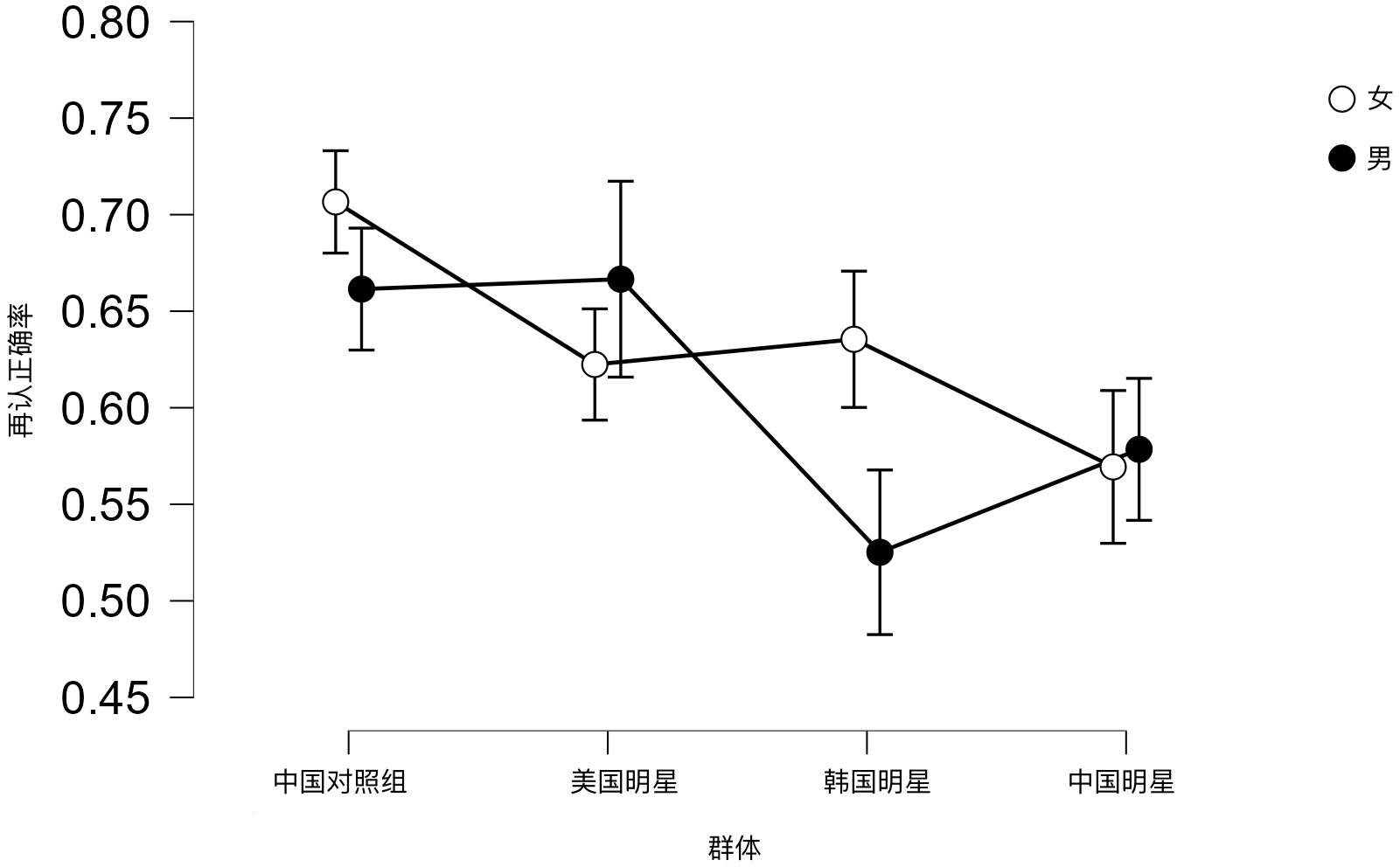 进一步, 对群体因素进行事后检验, 结果见表 4. 中国对照组的再认正确率显著高于中国明星 (t = 5.907, p < .001, d = .997), 韩国明星 (t = 4.361, p < .001, d = .736); 中国明星的再认正确率显著低于美国明星 (t = 3.613, p = .001, d = .610); 其余各水平间的差异均不显著.
