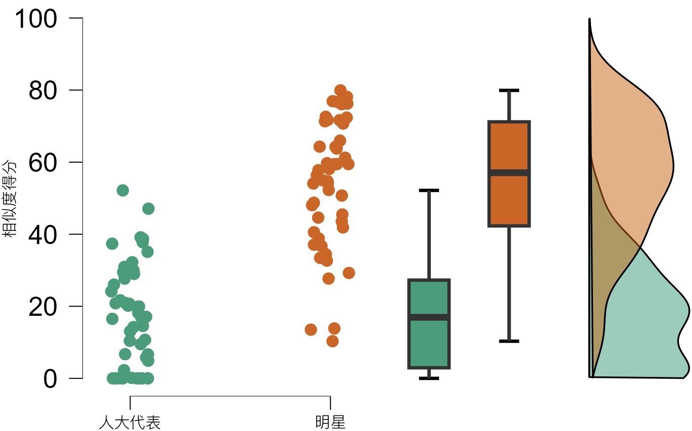 中国明星的相似度均值为 54.430 (SD = 18.166), 中国代表的相似度均值为 16.958 (SD = 14.179), 相似度的范围是 0-100. 二者有显著差异 (W = 162.000, p < .001, r = .870), 说明中国明星的相似度显著高于中国代表的相似度. 相关描述统计见图 4.