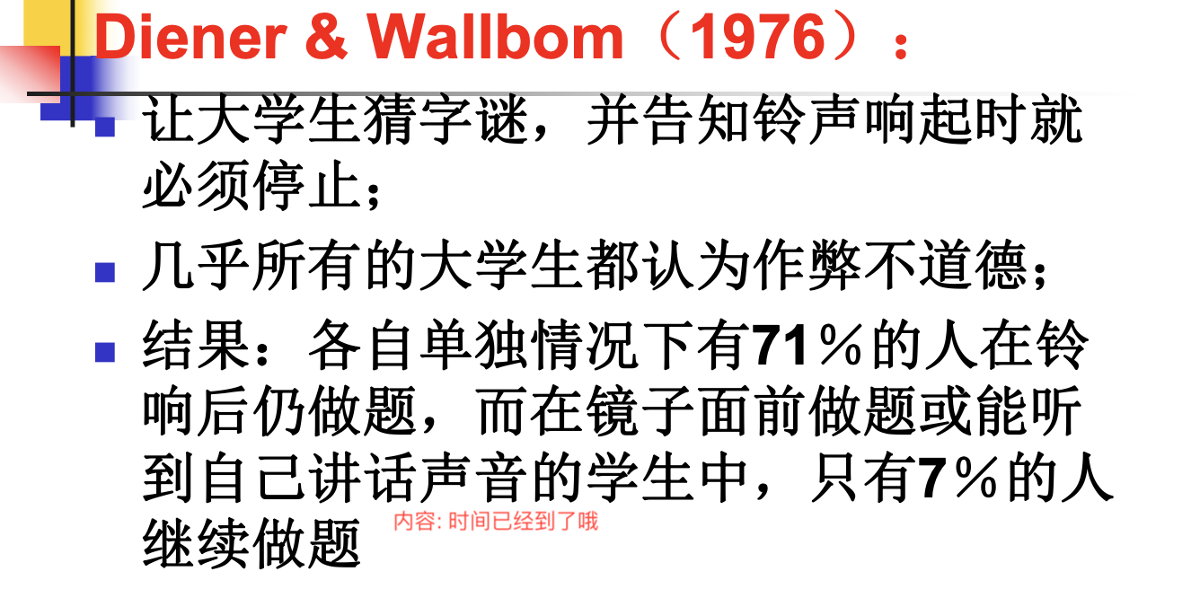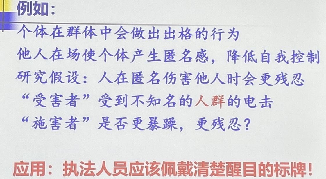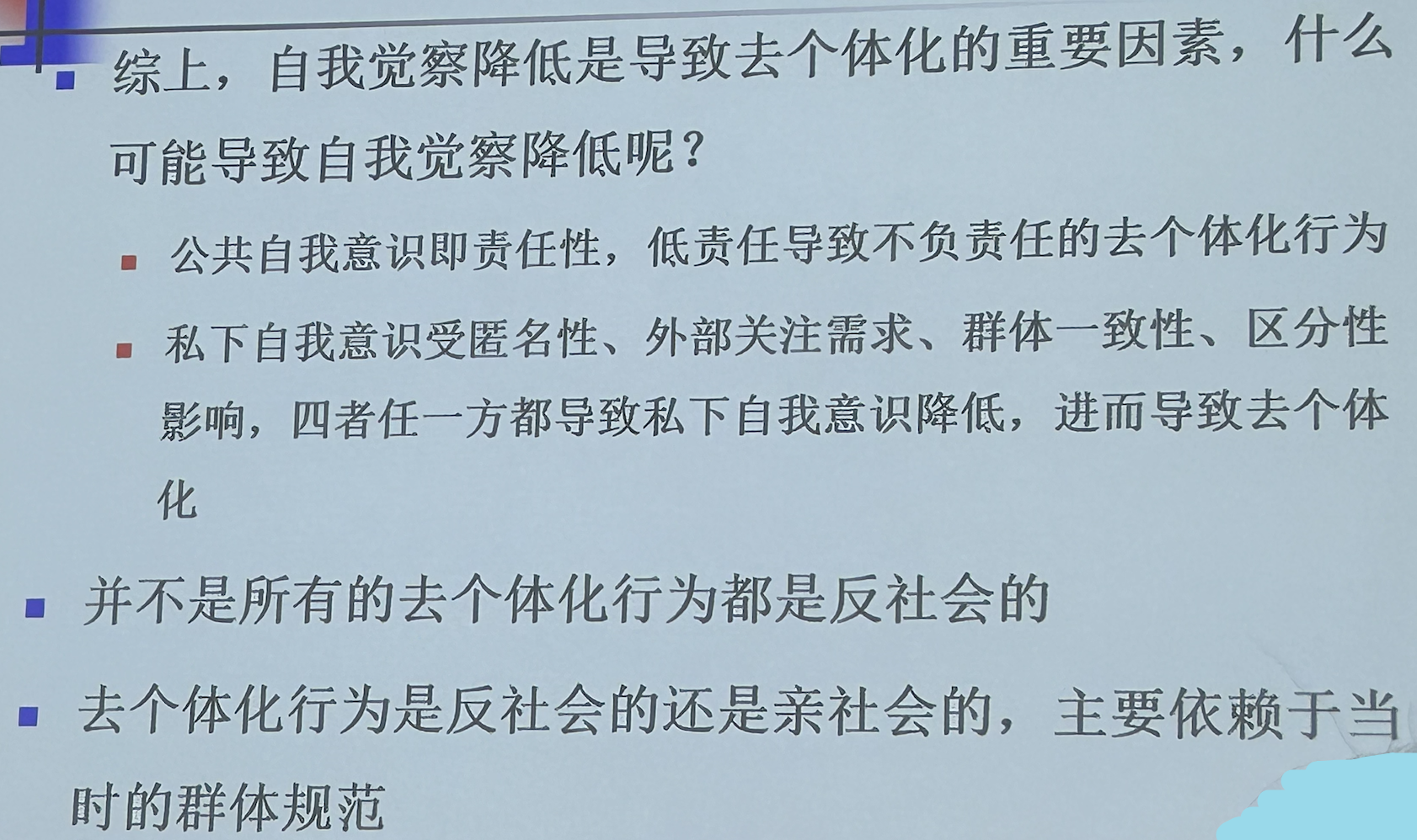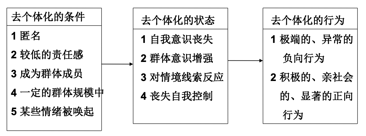 - 去个体化: 在群体中,人们有时会感到自己被淹没在群体之中,个人意识和理解评价感丧失,个体的自我认同被群体的行动与目标认同所取代,个体难以意识到自己的价值与行为,自制力变的极低,结果导致人们加入到重复的、冲动的、情绪化的,有时甚至是破坏性的行动中去