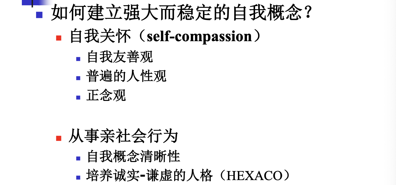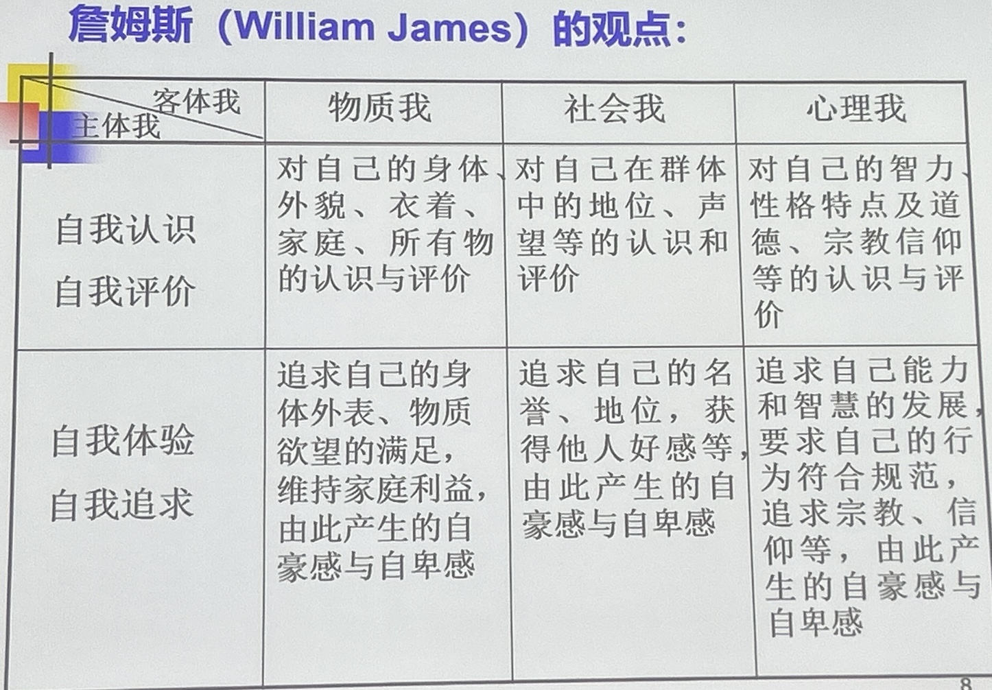 - 自我概念: 自己对自己的意识,是自己对自己存在的觉察,即认识自己的各方面的特征; 包括物质我、社会我、心理我; 也即客体我