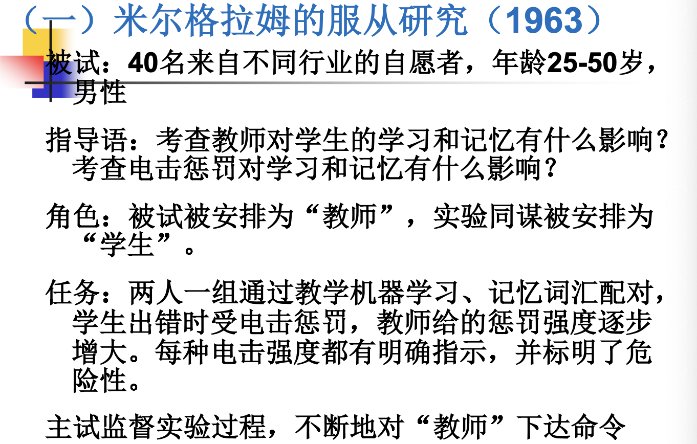 - 社会影响: 他人、团体、社会都可能对人的行为产生影响, 例如团体一致性压力、服从等