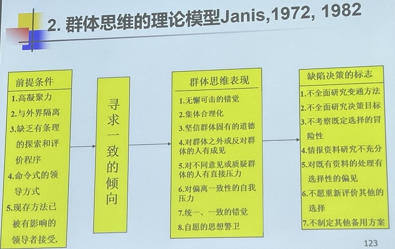 - 群体思维: 高凝聚力的群体在进行决策时,成员的思维会高度倾向于一致,以致于压抑了成员对其他变通行动路线的现实性评估; 这种群体决策时的一致的倾向性思维方式叫做群体思维, 也叫群体盲思或群体迷思