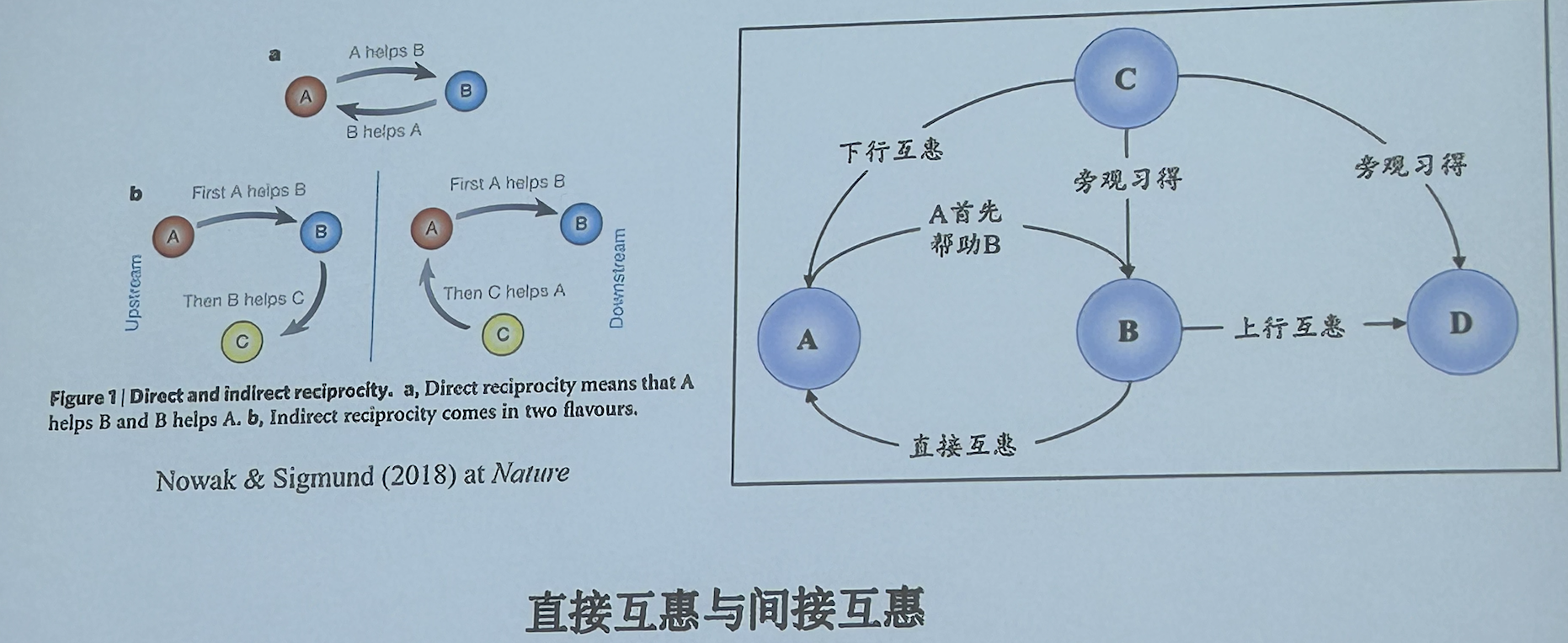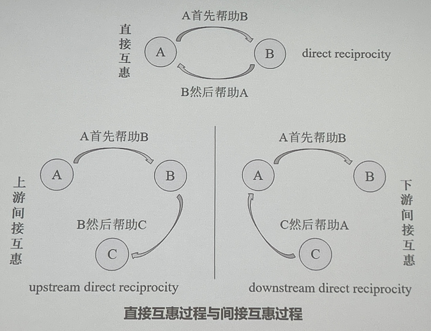 比如帮助、尊重、支持、爱, 提供资产的一方坚信以后可以得到回报; 包括直接互惠和间接互惠 (上游间接互惠/下游间接互惠) - 攻击行为: 也叫侵犯行为,指有意伤害别人,并且不被社会规范所许可的行为