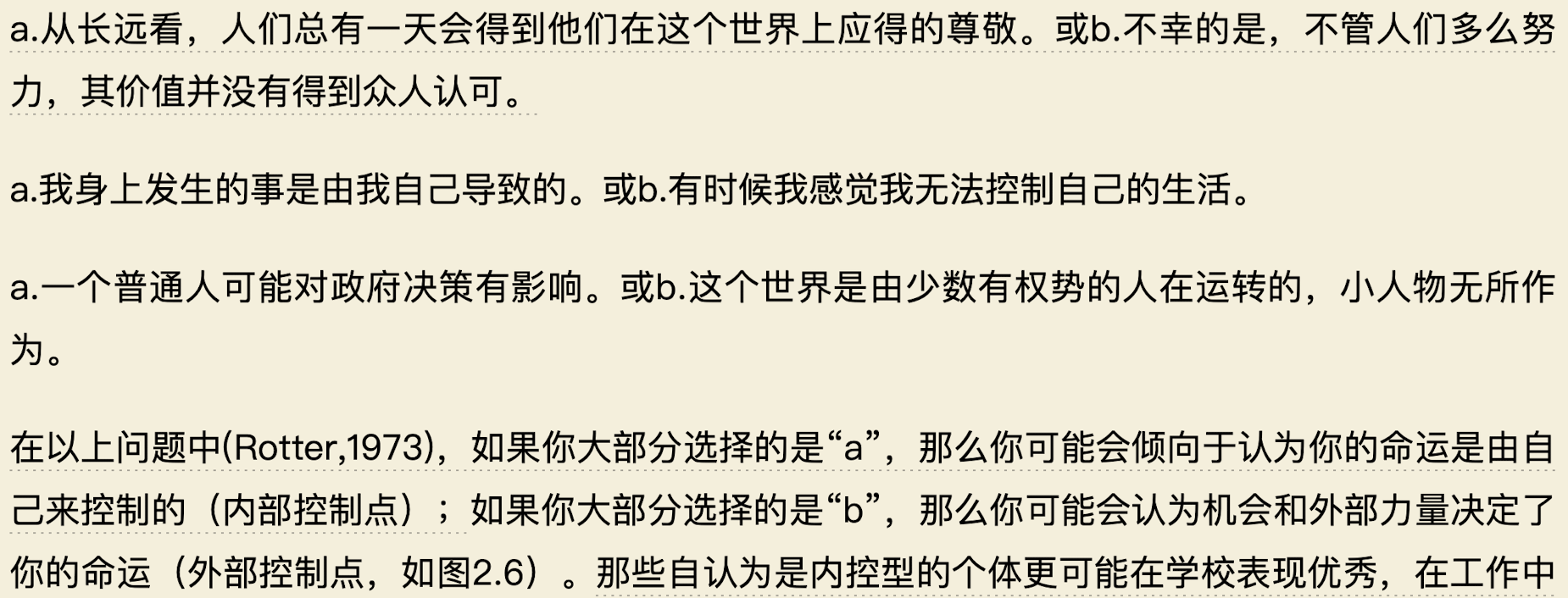 Internal Locus of Control: 实体观/发展观可能在其中起到调节作用; 对他人处于困境的原因的归因影响亲社会行为"哪里贵了? 多想想自己的原因, 这么多年工资涨没涨, 有没有努力工作?" - 低自我中心