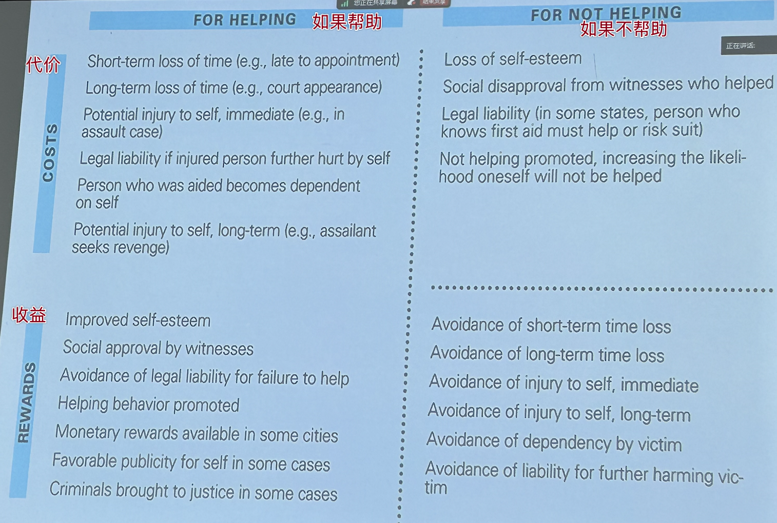 他人起观众作用: 由于人们可能不清楚在场他人将如何评价自己的行动,而人们又不愿意在众人面前处于尴尬地位,因此会犹豫不决,这可能也抑止了助人行为 - 干预的成本