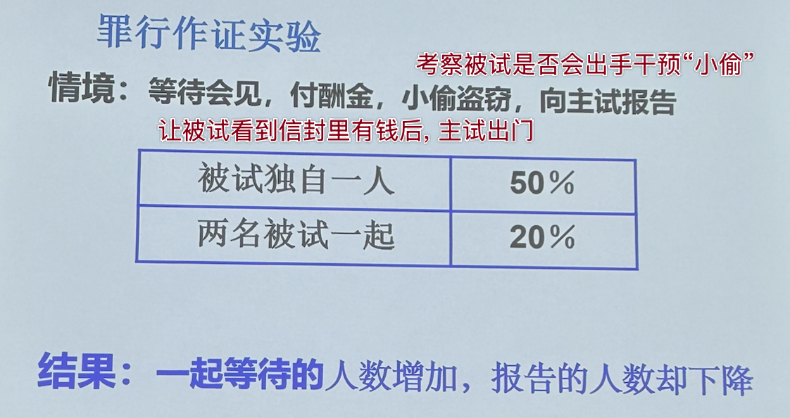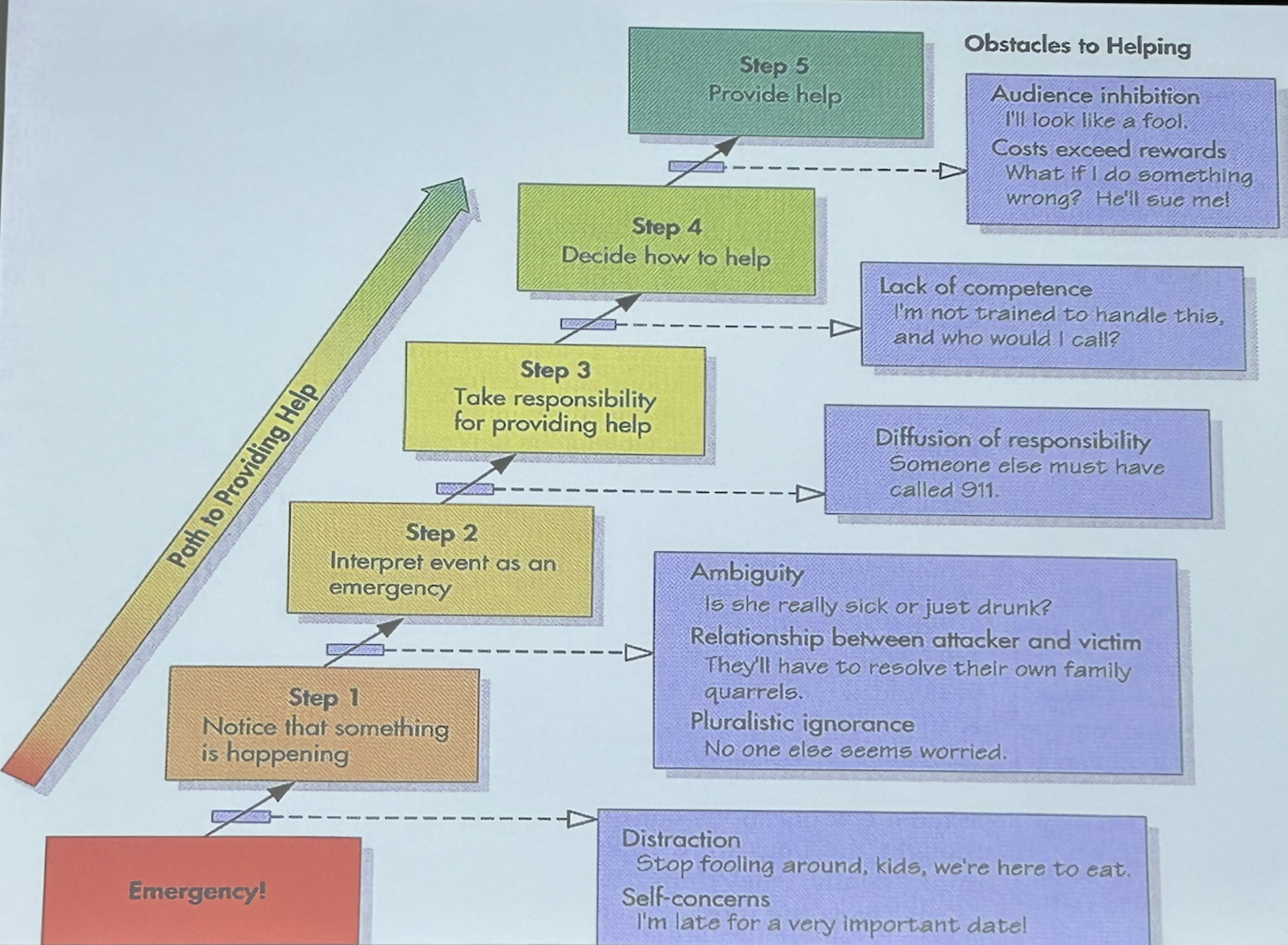 Diffusion of Responsibility: 他人在场减少了紧急情况下人们采取干预的可能性。人们会倾向于认为自己助人的责任被在场的他人分散了,在场的他人数目越多,就越少有人提供帮助 - 情景模糊与从众