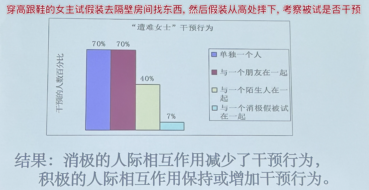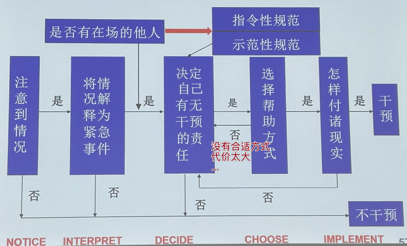 例如突出紧迫性、危险性、他人相助的必要性、特定他人的责任 - 决定自己有无责任: 在场他人的影响 (他人积极行动还是消极漠视)