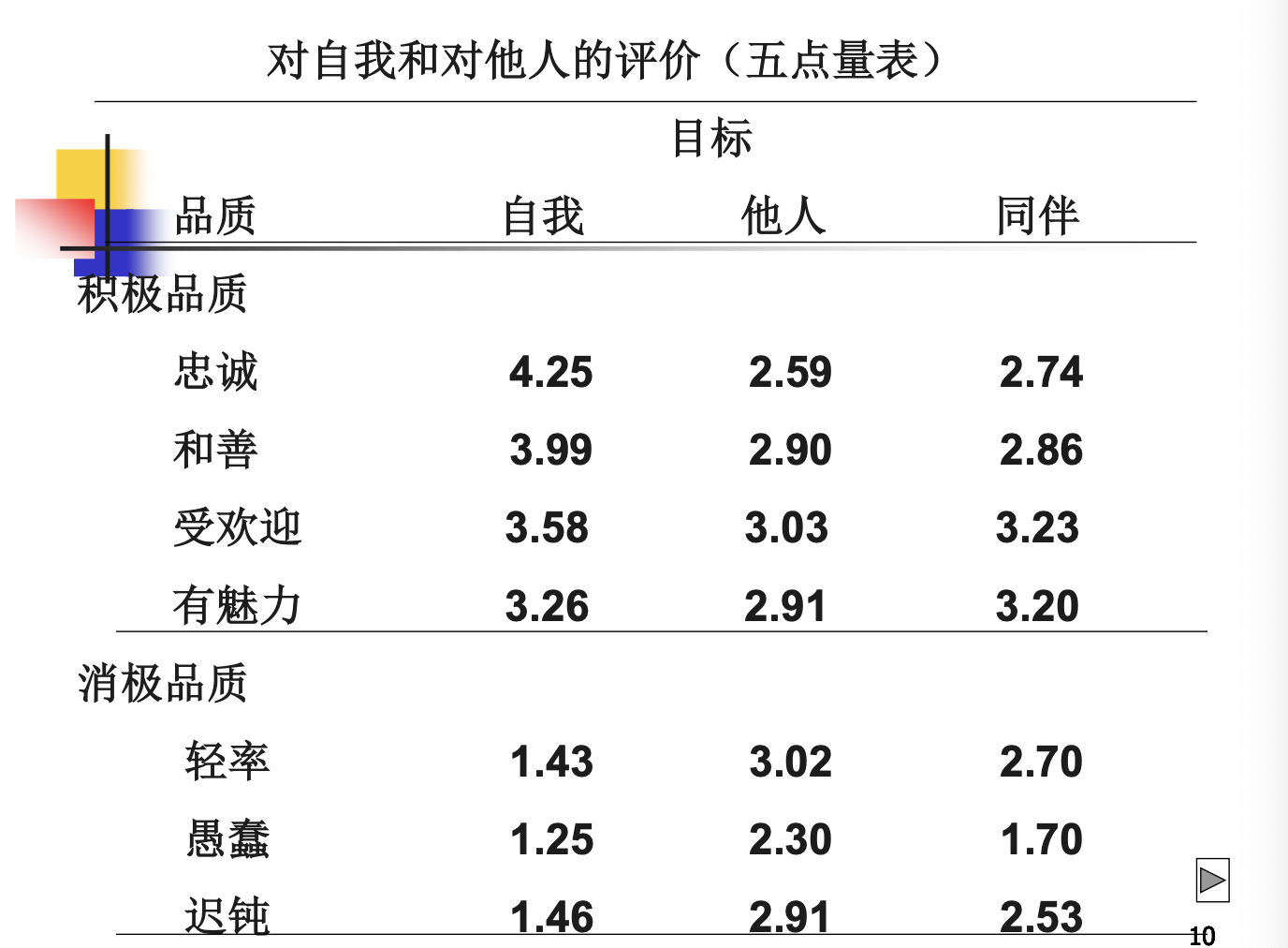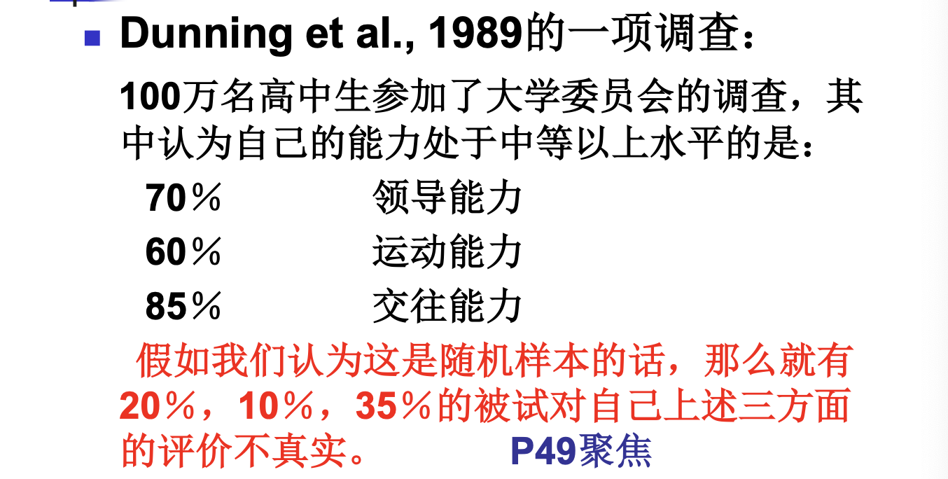 - 自我服务偏差: 个体在评价自己的能力、行为、成就时,倾向于将成功归因于自己的内在因素,而将失败归因于外在因素; 即把自己知觉为更好的倾向