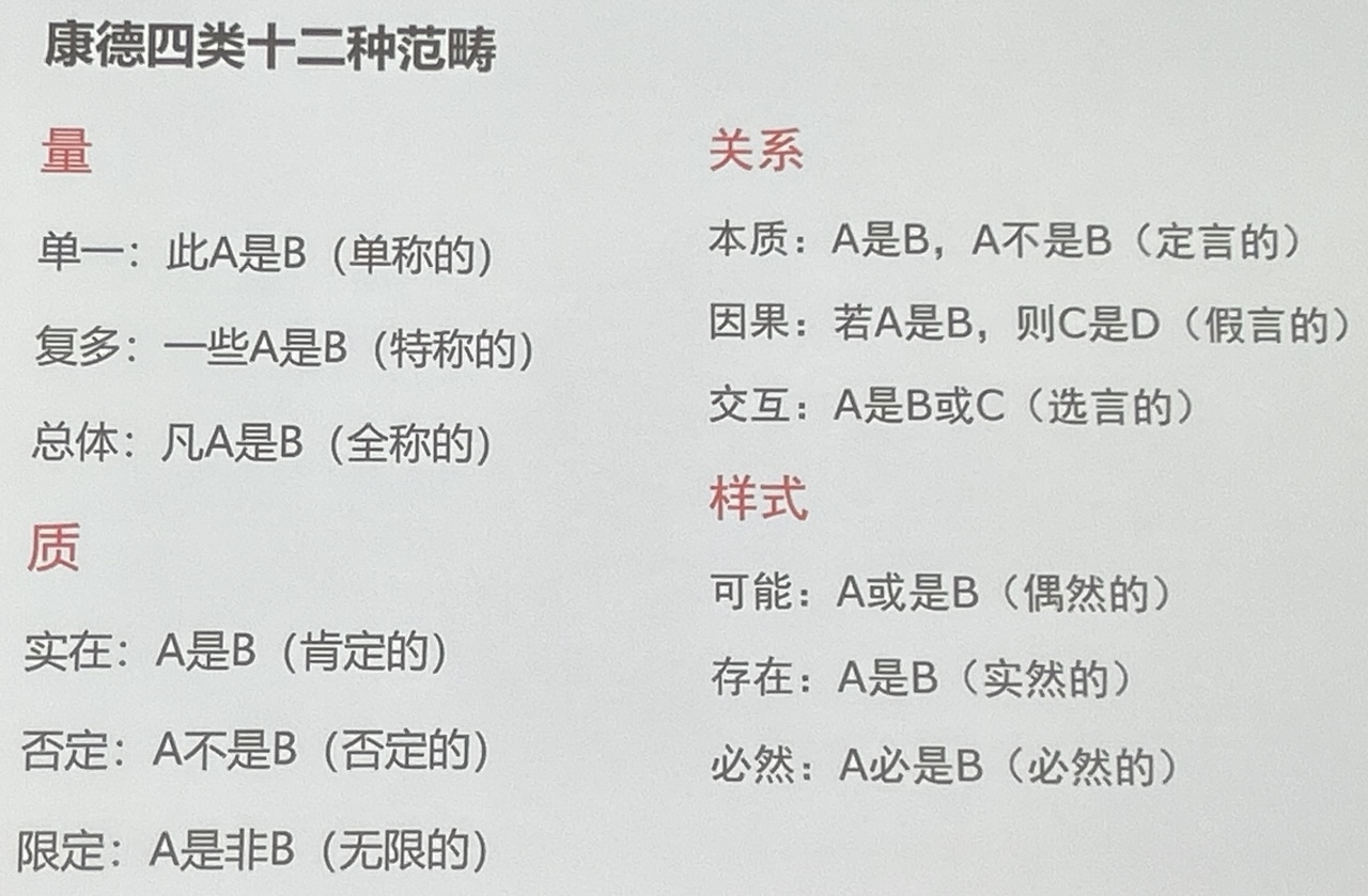 Kant认为人的认识是基于四类量/质/关系/样式十二种先验范畴形成的